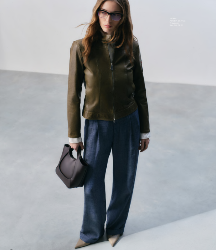 This outfit offers an elegant yet relaxed look, ideal for the city. It features: